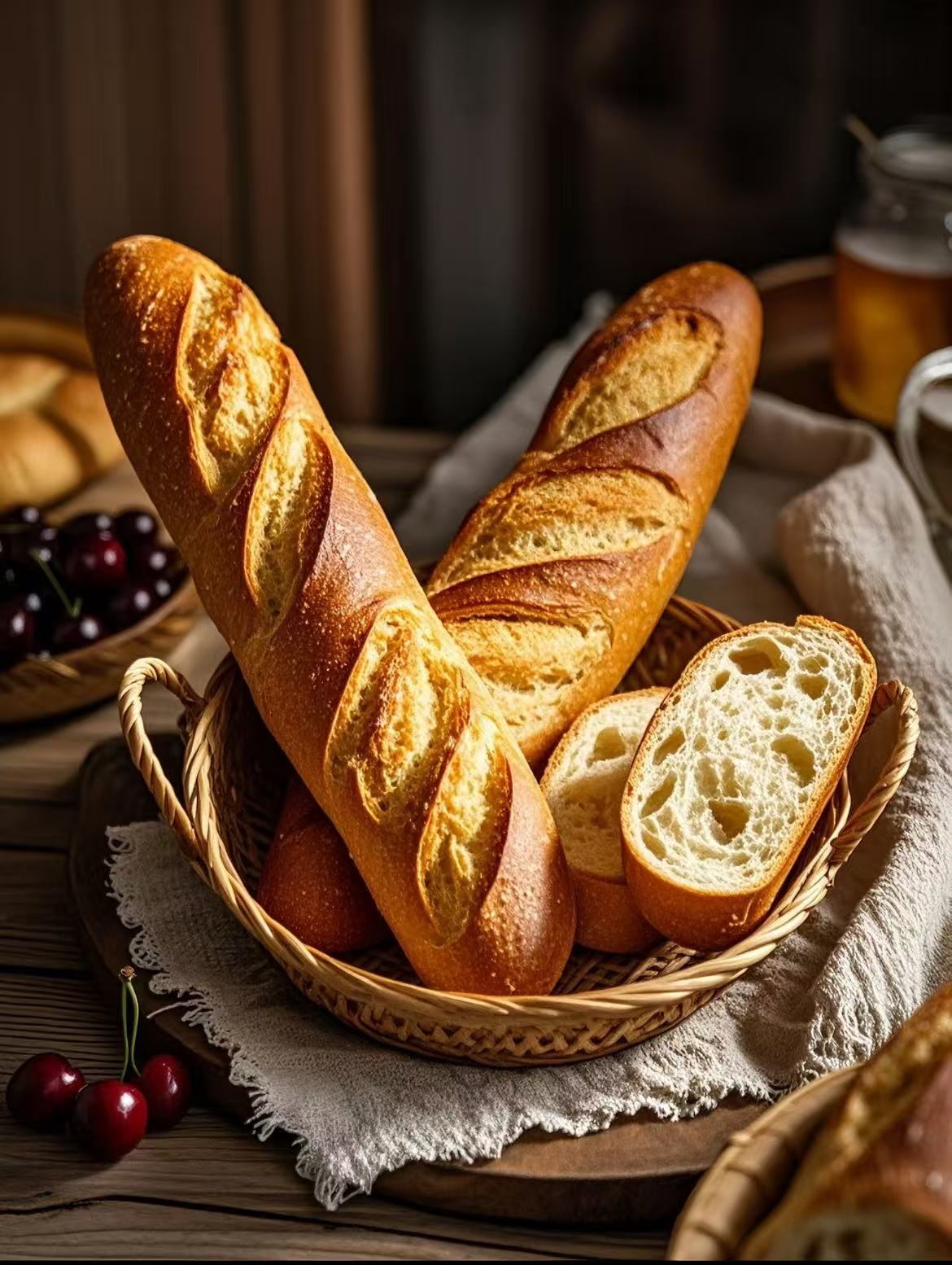 法棍,作為法國面包的標志性**,早已超越了食物本身的意義,成為一種文化符號、一種生活儀式。它以修長的外形、金黃的表皮、清晰的割紋和硬核的口感,詮釋著法式生活的精致與隨性,讓無數人感受到地中海飲食文化的獨特魅力。