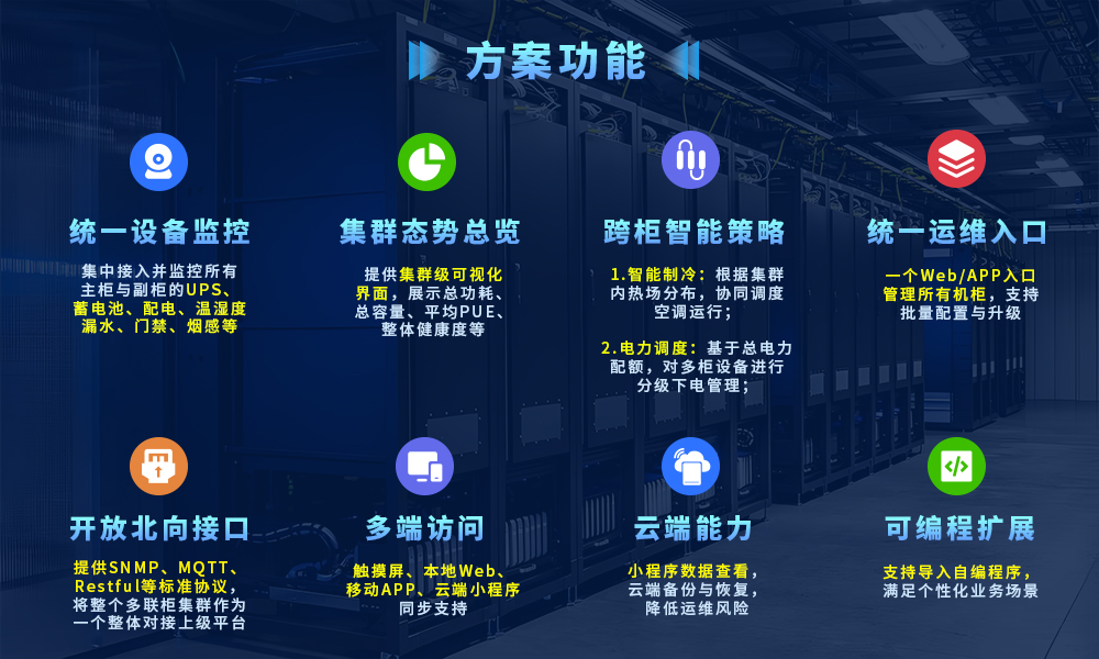跨柜智能策略支持根據集群內熱場分布協同調度空調運行,以及基于總電力配額對多柜設備進行分級下電管理;